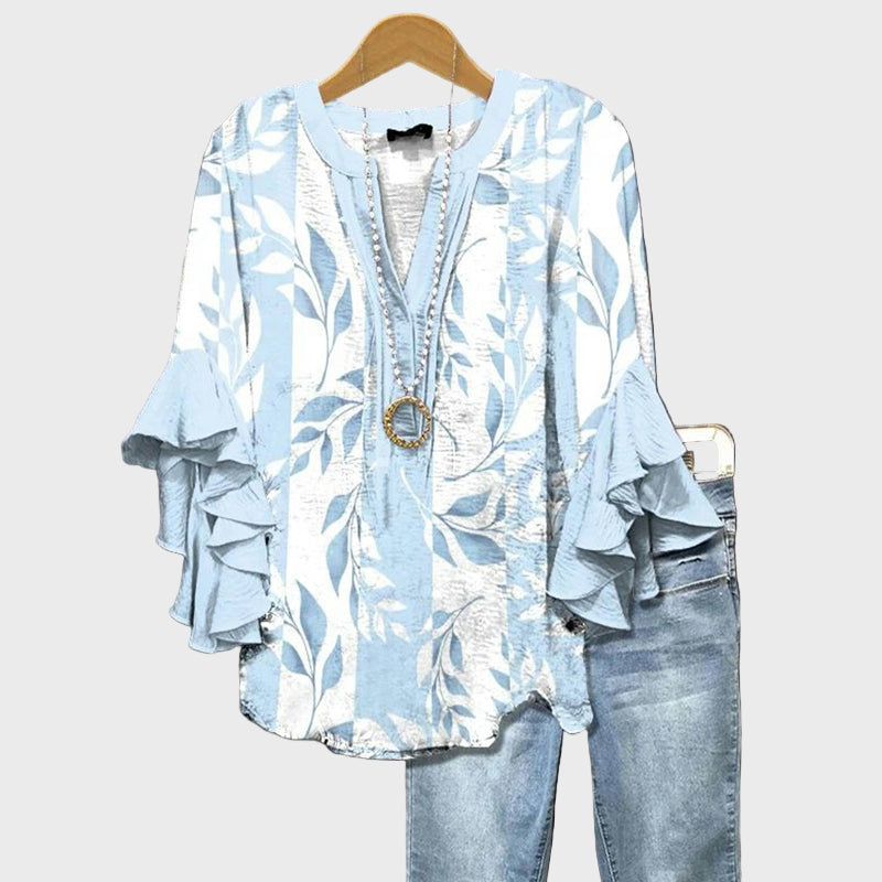 Rafraîchissez votre style estival avec ce haut bleu clair, orné de motifs feuillus élégants en blanc. Les manches à volants ajoutent une touche de romantisme, tandis que sa coupe décontractée assure confort et élégance tout au long de la journée.