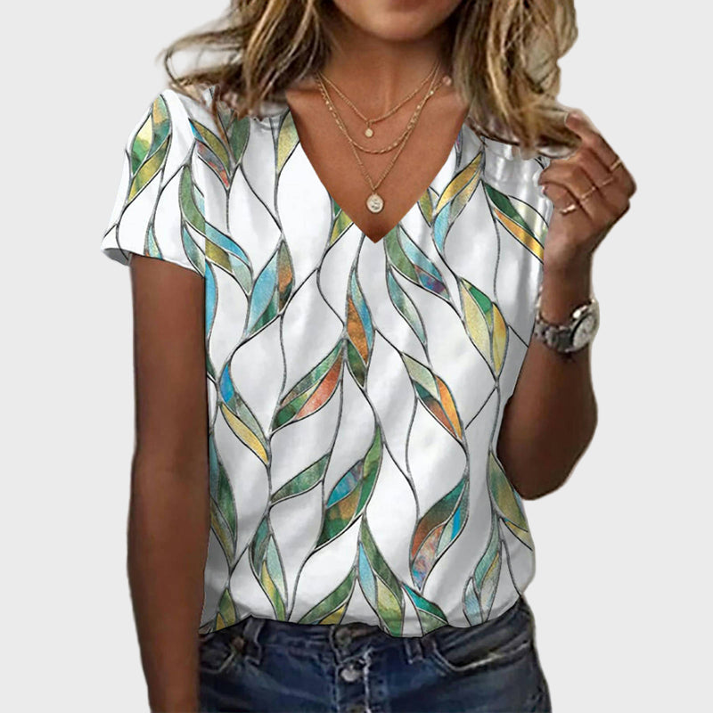 Mettez en valeur votre côté moderne avec ce haut à base blanche, orné de motifs ondulés colorés dans des nuances de vert, de bleu et d'or.
