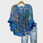 Mettez en valeur votre style artistique avec ce haut en bleu éclatant, orné de motifs abstraits colorés qui évoquent une toile de peinture. Les manches à volants ajoutent une touche d'élégance et de mouvement, tandis que sa coupe décontractée assure un confort optimal, parfait pour toutes vos occasions, qu'elles soient quotidiennes ou spéciales.