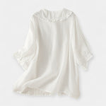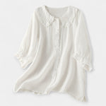 Le col Peter Pan avec volant apporte une touche unique, parfait pour élever vos tenues décontractées, que ce soit avec des jupes ou des pantalons.