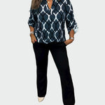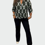Chemisier Décontracté Femme avec un imprimé géométrique moderne en tons kaki et blancs. Ce chemisier allie confort et élégance grâce à sa coupe décontractée et ses manches retroussées.