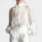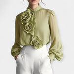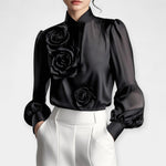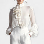 T-shirt Blanc Élégant avec des applications 3D en forme de rose, ajoutant une touche de romantisme et de luxe à votre garde-robe. Le col haut et le tissu légèrement transparent créent une silhouette aérienne et raffinée, parfaite avec des pantalons ou des jupes tailleur.