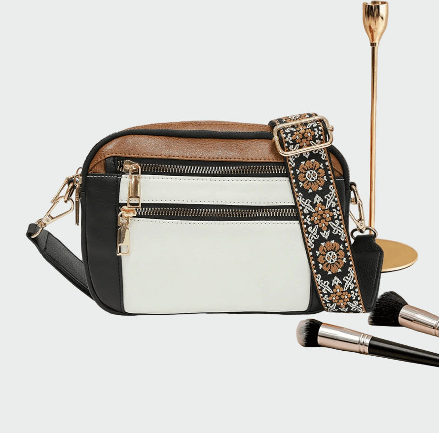 Sac à bandoulière élégant en noir alliant design moderne et praticité. Avec deux zips extérieurs ornés de détails métalliques dorés, ce sac ajoute une touche de luxe à votre quotidien.