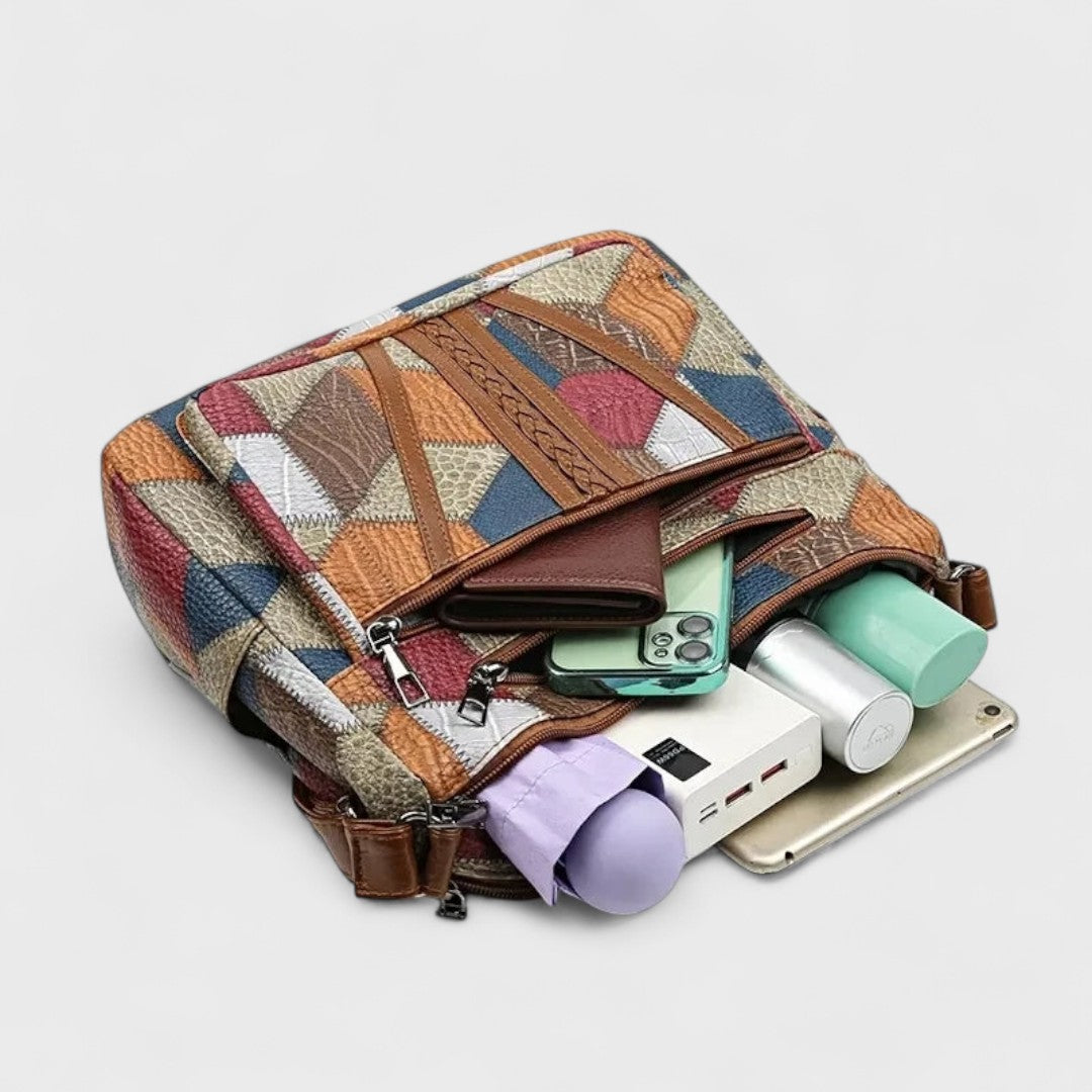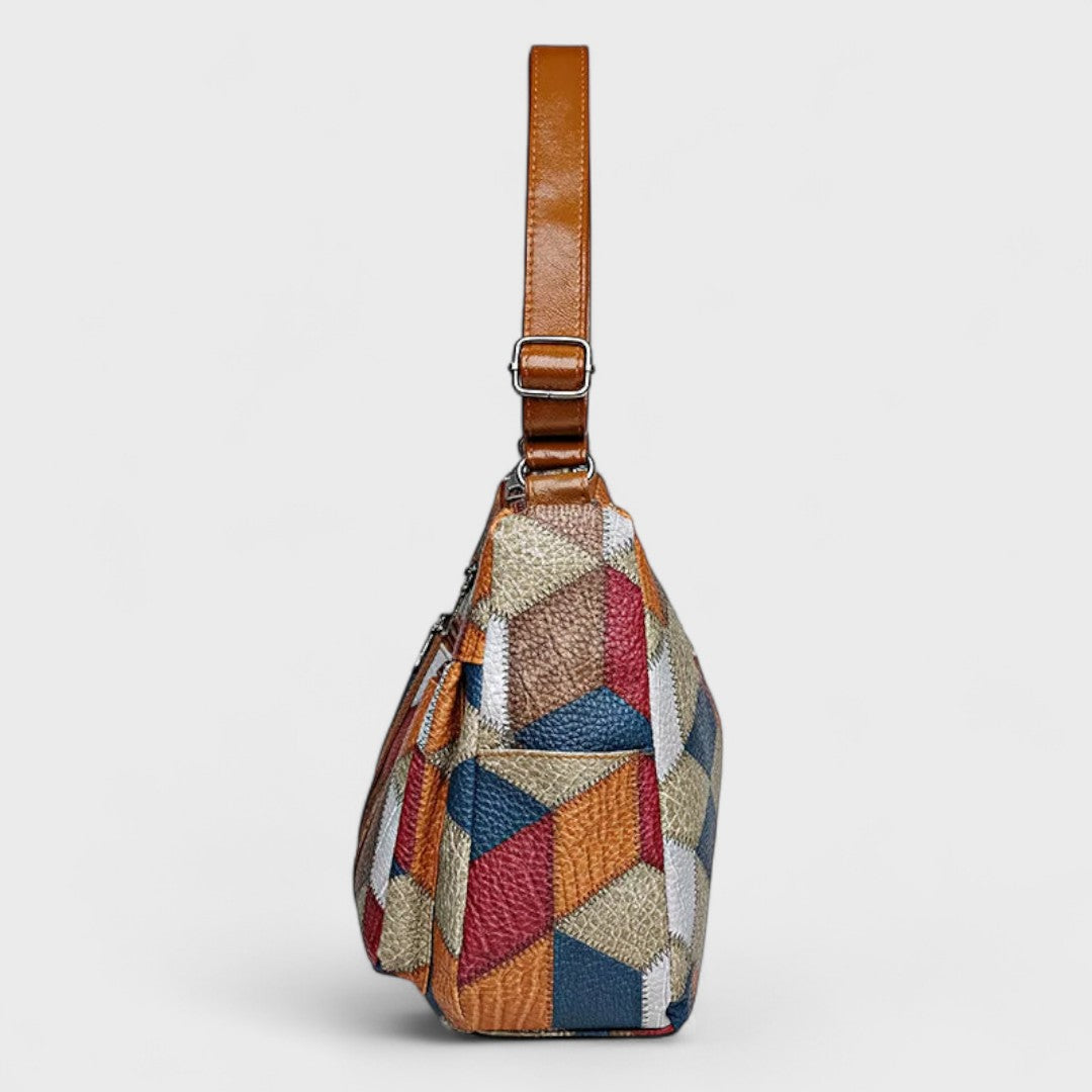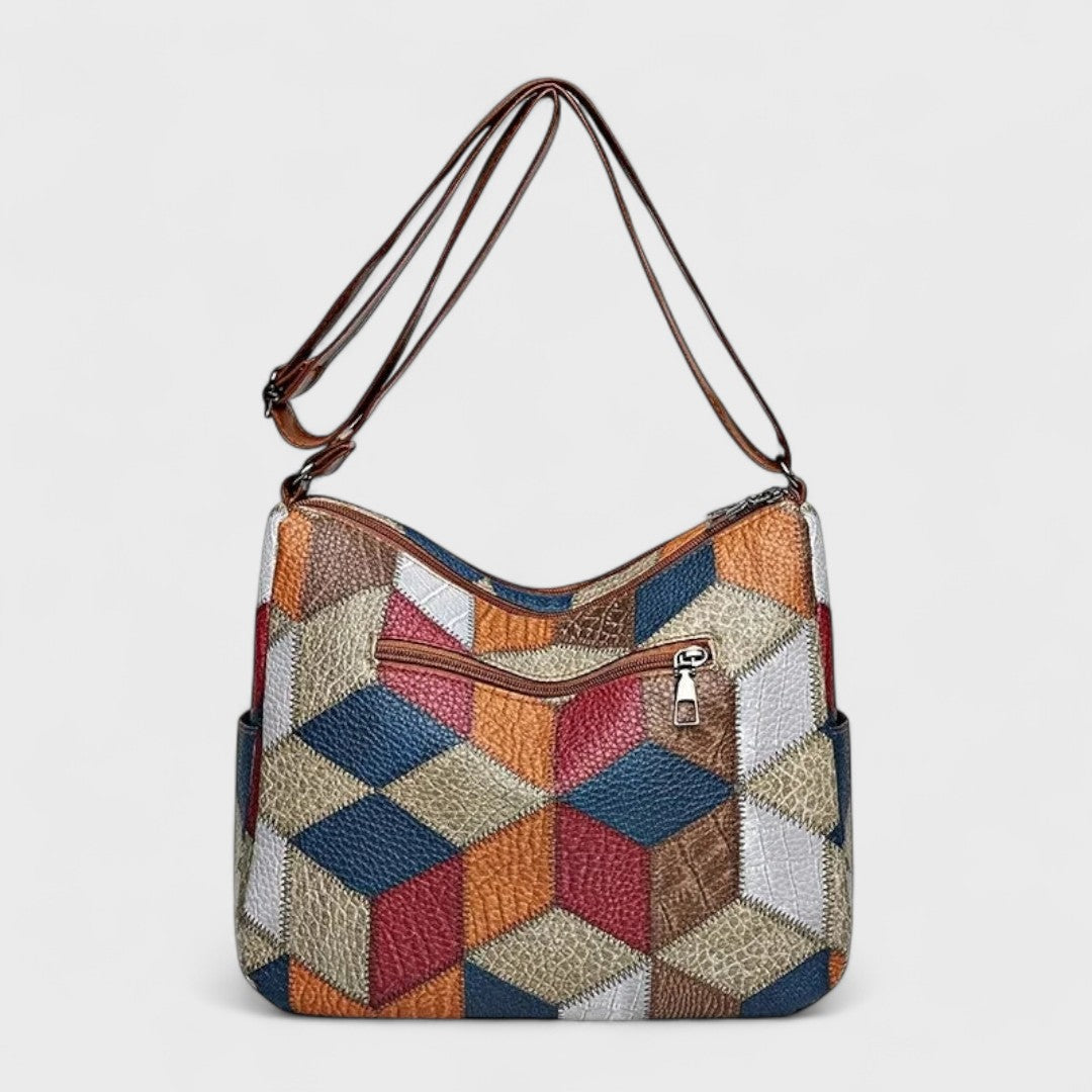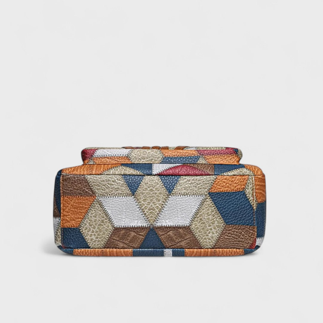 Découvrez le sac Soraya, où style raffiné rencontre praticité. Avec son riche patchwork géométrique et ses accents en cuir, il est conçu pour le rangement facile de toutes vos affaires essentielles.