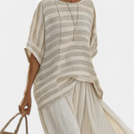 Ensemble Daisy: Un look décontracté avec un charme naturel. Cet ensemble associe un haut rayé à la coupe douce et un pantalon fluide avec une large jupe, parfait pour les journées ensoleillées.