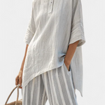 Découvrez l'ensemble Daisy, un style apaisant aux lignes modernes, parfait pour les journées ensoleillées. Ce look équilibré et élégant se compose d'un top asymétrique à coupe décontractée et d'un pantalon rayé dans des tons neutres.