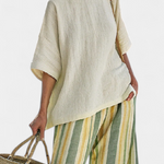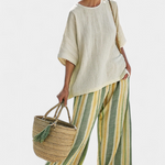 Naturel et frais, l'ensemble Daisy en nuances d'olive et de jaune doux allie un haut ample en lin de bambou à un pantalon à rayures verticales, créant une esthétique décontractée avec une touche d'élégance.