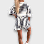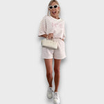 Découvrez notre ensemble dynamique, conçu pour des apparences quotidiennes distinctes alliant style et confort. La blouse oversized s'associe parfaitement avec le short taille haute, créant un look qui se démarque.
