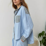 Offrant une combinaison unique d'élégance et de confort, cet ensemble se distingue par ses détails raffinés. Les touches de carreaux gris au col, à la poche et aux poignets créent un contraste moderne avec la douce couleur bleu ciel.