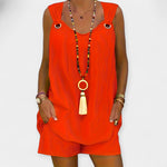 Découvrez l'ensemble chic d'été parfait qui allie fraîcheur et élégance. Le débardeur à décolleté en V met en valeur la poitrine de manière discrète, tandis que le short taille haute offre un ajustement confortable et une coupe féminine.