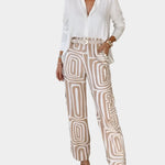 Donnez un nouveau souffle à vos tenues quotidiennes avec le pantalon géométrique. L'imprimé raffiné dans des tons neutres ajoute du style sans excès, tandis que la coupe confortable le rend idéal pour chaque occasion.