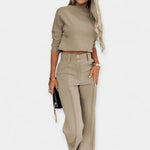 Crop top ajusté qui met en valeur votre décolleté, associé à un pantalon aérien pour un confort optimal et un mouvement élégant.