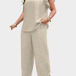 L'ensemble lilas avec un pantalon large et un haut à volants aux manches allie style et confort, parfait pour chaque occasion – d'une promenade l'après-midi à une sortie spéciale.