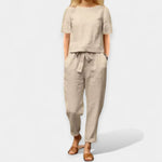 Composé d'un haut léger et d'un pantalon ample avec cordon, cet ensemble allie confort et style en toute occasion.