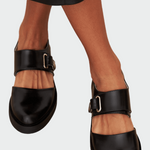 Chaussures en cuir noires avec boucle métallique alliant style minimaliste et confort exceptionnel.