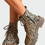 Bottines pour femmes avec imprimé animal alliant style et confort. Ces bottines sont conçues avec des lacets et une fermeture éclair pratique sur le côté pour un enfilage facile.