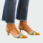 Découvrez nos escarpins multicolores à talons bas, alliant confort et style ludique. Les nuances vibrantes de bleu, jaune et marron ajoutent du caractère à chaque tenue.