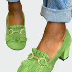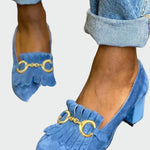 Escarpins Élégants au caractère unique et aux détails raffinés. Le décor métallique sur le dessus ajoute une touche de luxe, tandis que les franges décoratives fusionnent esthétique rétro et moderne.