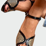 Découvrez nos sandales élégantes, alliant un design unique en noir et beige. L'ouverture à l'avant ajoute une touche de féminité, tandis que la bride réglable à la cheville assure un ajustement parfait pour un confort optimal.