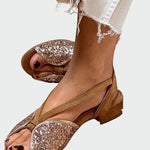 Mettez en valeur votre style avec ces élégantes sandales à talon bas. La combinaison du suède marron et des détails dorés scintillants crée un équilibre parfait entre simplicité et éclat.