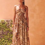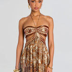 Robe Maxi Impressionnante avec un motif paisley riche dans des nuances d'or, de marron et de terre cuite. Cette pièce unique présente un bustier sans bretelles avec des ouvertures élégantes qui mettent en valeur votre féminité.