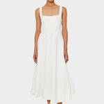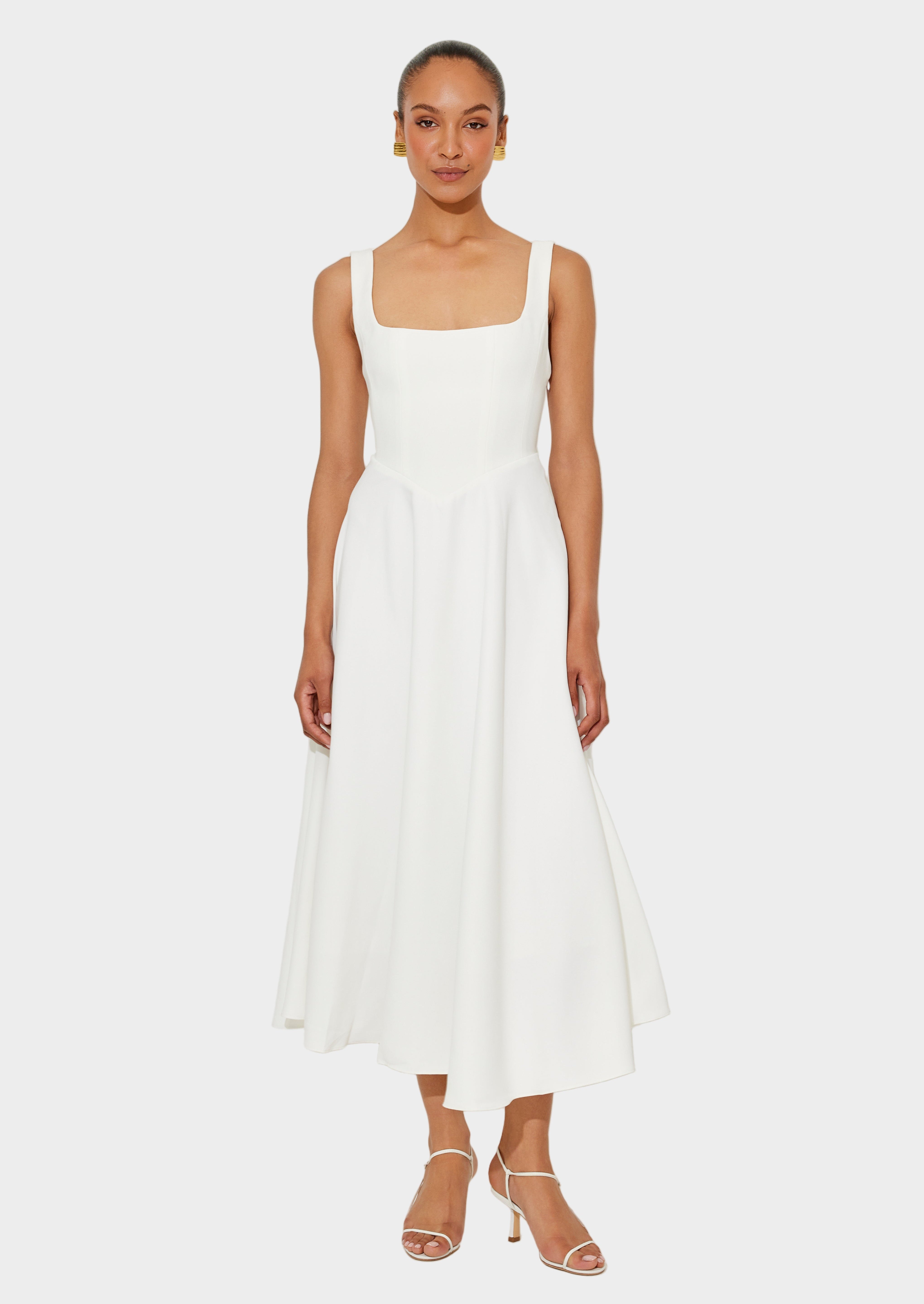 Élégance intemporelle avec notre robe midi blanche au style minimaliste. Son design épuré et son excellent ajustement en font le choix parfait pour toutes vos occasions formelles et semi-formelles.