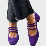 Élégance et confort réunis avec nos escarpins violets à trois lanières. Leur couleur vive attire tous les regards, tandis que la forme carrée à l'avant et le petit talon garantissent une stabilité optimale pour vos pas.