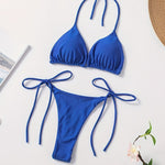 Découvrez notre ensemble de bikini moderne, conçu pour mettre en valeur votre féminité avec élégance et audace. Le haut à nouer offre un soutien optimal tout en sublimant votre décolleté, tandis que le slip en V flatte les hanches et crée une silhouette séduisante.